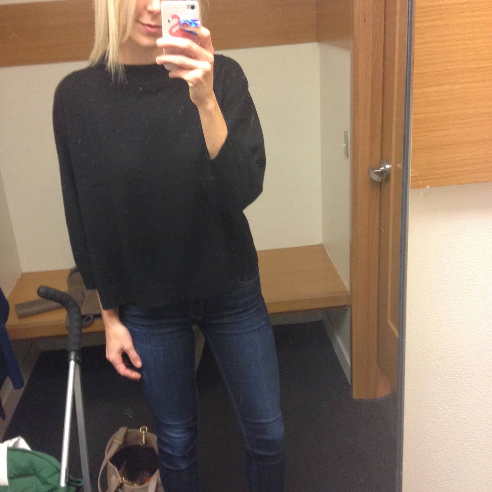 I also picked up this sweater in the store. It was $95 and I got it for $19! It runs on the large side, I am wearing an XS. It is a boxy fit, but I like that paired with skinny jeans. I am tempted to order the tan color as well, they are great basic sweaters.